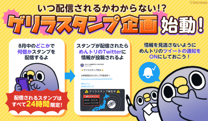 本企画は、インクルーズの大人気キャラクター「めんトリ」の期間限定スタンプを、8月中に不定期でいくつか配信するという、配信タイミングが全く読めない「ゲリラ」的なドキドキの内容となっております。