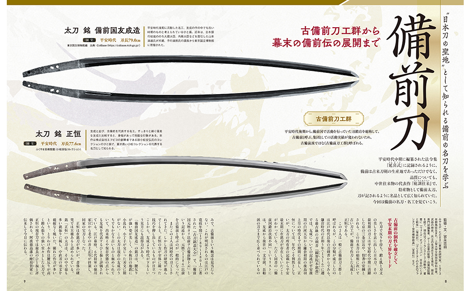 大包平や山鳥毛、姫鶴一文字といった備前を代表する名刀や、長光、光忠、則光など備前で活躍した伝説的な刀工たちを取り上げ、解説する。