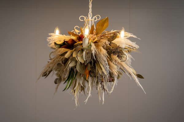 ユーカリやススキ、レモンリーフなどナチュラルな雰囲気が特徴的な吊り中型タイプ。インテリア以外にショップディスプレイとしても存在感のあるシャンデリア。