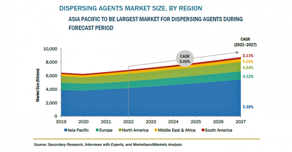 分散剤の市場規模は、2022年の71億米ドルからCAGR5.5%で成長し、2027年には93億米ドルに達すると予測されています。2021年は、アジア太平洋地域が金額ベースで最大シェアを占めました。これは、中国、インド、日本などを中心とした国々で、最終用途産業からの需要が高まっていることに起因しています。中東・アフリカ市場は、インフラ支出の増加と低いベース効果により、2027年まで安定した成長を記録すると予測されています。