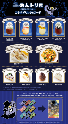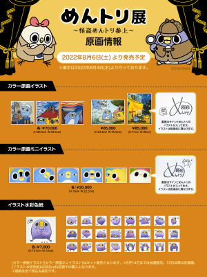 初の開催となる「めんトリ」の原画展が西武渋谷店で行われます。「めんトリ」作者直筆のイラスト水彩色紙(各7,000円)や、「イモウト」と「ヒデヨシ」も選べるカラー原画ミニイラスト(各20,000円)、旅が大好きな「めんトリ」が様々な絵画に扮してクスッと笑えるカラー原画イラスト(70,000~85,000円)も【限定各1点のみ】で販売されています。またカフェでは「めんトリ展~怪盗めんトリ参上~」限定の「コラボドリンク」と「コラボフード」もご用意しており、コラボ商品を注文していただいたお客様には9種で1つのイラストになるように作られた「購入者限定カード」をお渡しいたします!数量限定となりますので是非お早めにお立ち寄りくださいませ!