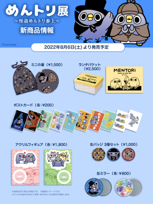 さらに「めんトリ展~怪盗めんトリ参上~」の為に販売される新作グッズも販売し、めんトリの公式ECサイト「めんトリストア」のみでの販売となっている人気商品も、店舗販売を致します。さらに!さらに!今回は「めんトリ展」で販売される原画データを今話題のNFTで販売する予定で、詳細は追って、発表する予定です。「めんトリ」の公式TwitterやHPでも情報公開しますので要チェックです!!