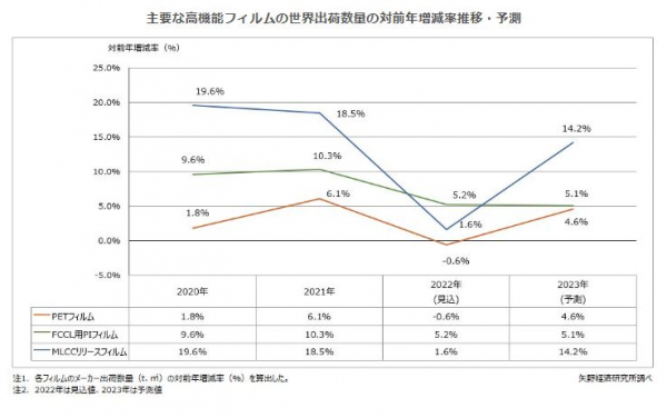 ただ、現在の高機能フィルム市場はFCCL(Flexible Copper Clad Laminate:フレキシブル銅張積層板)やMLCCなど幅広い分野で多種多様な製品に搭載される製品の部材・副資材として使用されるものが主力であり、用途の裾野が広い。川下市場で一つの製品が販売不振に陥っても他の製品でカバーすることが可能であるため、部材・副資材向けの高機能フィルムの需要は全体的にみて最終製品の販売量増減の影響を受けにくくなっている。そのため、川下メーカーサイドの生産調整や在庫状況により一時的に需要が縮小することはあっても、長期的な低迷には至らないものと考えられ、2023年の主要な高機能フィルムのメーカー世界出荷数量はMLCCリリースフィルムが前年度比14.2%増、FCCL用PIフィルムは同5.1%増、PETフィルムは同4.6%増に回復すると予測する。