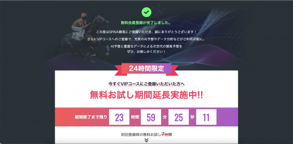 このたび SPAIA競馬に新規会員登録、会員登録完了の限定ページをご覧いただいたユーザーさまを対象に、期間内に VIPコースにご登録で無料お試し期間延長サービスを開始いたします。