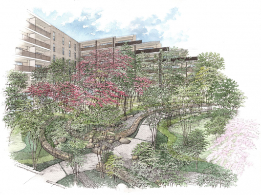 積水ハウスは、東急田園都市線「溝の口」駅徒歩12分、JR南武線「武蔵溝ノ口」駅徒歩11分に位置し、駅前の賑わいとは一線を画した住宅エリアである川崎市高津区久本三丁目に総戸数123戸のプロジェクトを始動させます。本物件は四季折々の表情を見せる緑豊かな中庭を設け、街の利便性を享受しながら、自然を”日常”として身近に感じられる住まいを提供。また中庭の魅力を享受できる個別ブースも構えた在宅ワーク可能なラウンジを計画しています。
