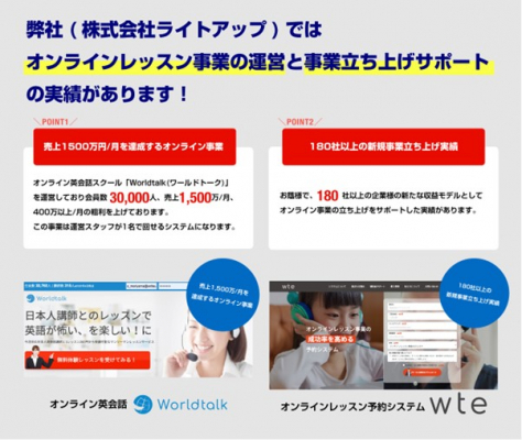 WTEの販売元となるライトアップでは、実際にオンライン英会話スクール「ワールドトーク」を10年以上運営し、会員数3万人以上のオンラインスクールを担当者1名で運営した実績がございます。