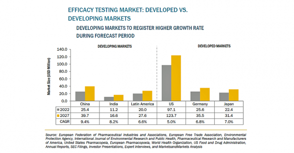 有効性試験の市場規模は、2022年の3億1500万米ドルからCAGR6.1%で成長し、2027年には4億2300万米ドルに達すると予測されています。製品の安全性に対する医薬品や化粧品の規制が、今後数年間における有効性試験市場の成長を促進すると思われます。また、医薬品有効成分(API)の有効性に注目が集まっていることから、医薬品の規制とバリデーションを考慮した、ヒト用医薬品の登録に関する技術要件の調和に関する国際会議(ICH)や適正臨床基準(GCP)などの規格団体、規制機関、業界団体、個人企業による防腐剤有効性試験(PET)方法が進歩しています。これらの規制機関の主な目的は、良好な文書規格と科学的健全性の達成です。
