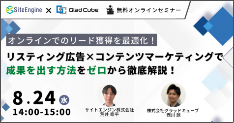 株式会社グラッドキューブ(本社:大阪市中央区 代表取締役 CEO 金島 弘樹 以下:グラッドキューブ)はサイトエンジン株式会社(本社:東京都世田谷区、代表:毛塚 智彦)と共催で、8月24日(水) 14:00~ コンテンツマーケティングとリスティング広告を駆使したリード獲得をテーマにオンラインセミナーを開催いたします。