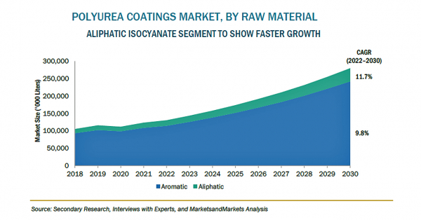 ポリウレアコーティングの市場規模は、2021年の12億米ドルからCAGR10.3%で成長し、2027年には20億米ドルに達すると予測されています。ポリウレア市場は、様々な用途で、ポリウレタン、エポキシ、その他のコーティングをポリウレアコーティングに置き換える可能性があることから、今後高い成長を示すと予測されます。