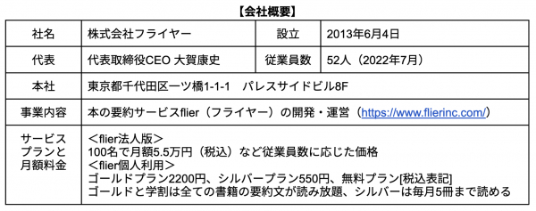 株式会社フライヤーは、本の要約サービス「flier(フライヤー)」を運営する、ITベンチャー(2013年6月設立)です。最大の特長は「書評(レビュー)」ではなく「要約」である点です。書き手の主観が入る書評とは異なり、著者の主張や論理(重要ポイントや全体像)を忠実にまとめ、読者に伝えます。書評でないため、出版社と著者から要約の許可を得る必要があり、要約した原稿にも目を通していただくことで、高品質なサービスを提供しています。