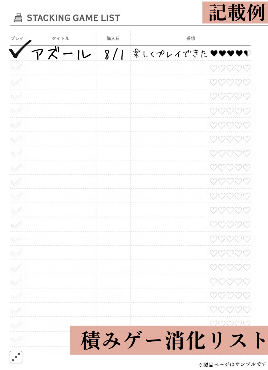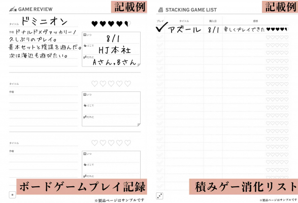 スケジュール帳としての機能はもちろん、ボードゲーマーにとって日々が少しだけ楽しくなるようなアイディアを詰め込んでいます。