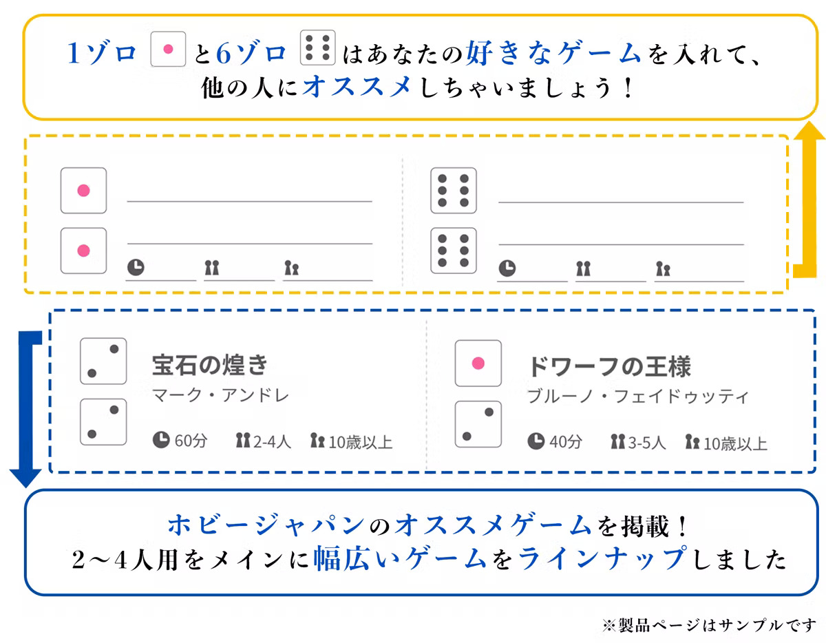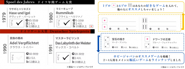 ホビージャパンが販売している多くのボードゲームが掲載されているので、ダイスを2つ振って、出た目のボードゲームを遊んでみましょう!