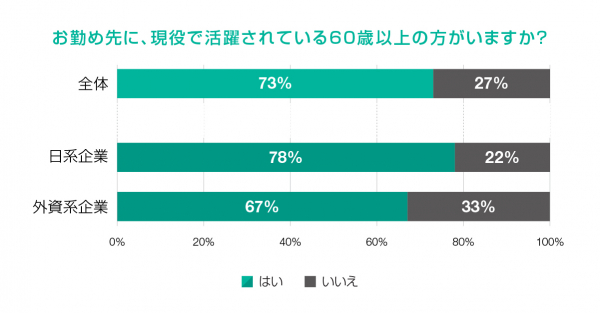 企業の資本別で見ると、日系企業勤務の会社員の回答で78%、外資系企業勤務の会社員の回答は67%と、日系企業で現役シニア世代がより多く活躍していることがわかりました。