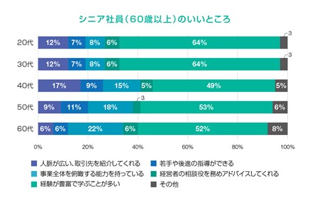 シニア社員のいいところは、どの世代の回答も「経験が豊富で学ぶことが多い」が1位でした。特に20代・30代の評価が高く、64%。他の世代の回答は約5割でした。2位は「人脈が広い、取引先を紹介してくれる」(20・30代、40代)、「事業全体を俯瞰する能力を持っている」(50代、60代)でした。