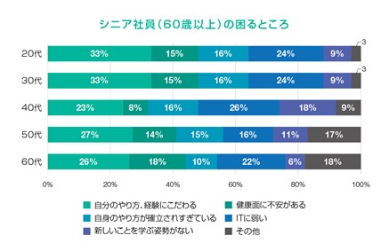 反対にシニア社員と働いていて困るところについては、40代会社員の回答以外の1位は「自分のやり方、経験にこだわる」。40代の回答は「ITに弱い」(25%)でした。