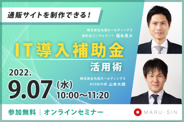 株式会社丸信は、9月7日(水)に、『IT導入補助金』について解説する無料Webセミナー「通販サイトを制作できる『IT導入補助金』活用術」を開催いたします。『IT導入補助金』について、株式会社丸信ホールディングスの補助金コンサルティングが徹底的に解説するとともに、IT導入支援事業者としてサポートする通販サイト制作の条件等についても説明させていただきます。