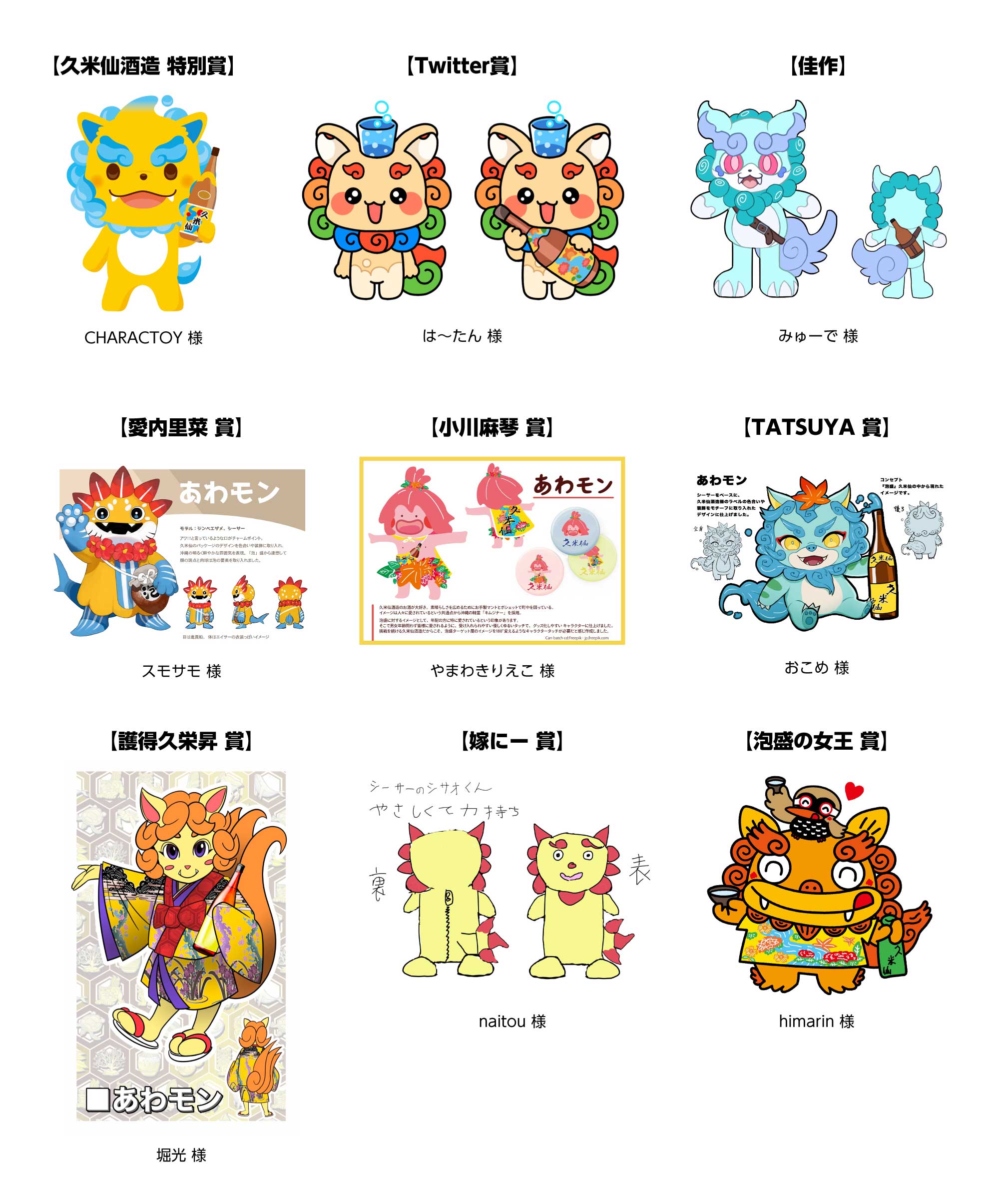 沖縄の特産品として知られる日本最古の蒸留酒「泡盛」。その泡盛の蔵元である久米仙酒造株式会社が、今年で創業70周年を迎えます。そこで今回、より多くの方に「泡盛」を知ってもらいたい、「泡盛」の魅力を全国に広げたい、という願いを込めて、マスコットキャラクターあわもりモンスター 通称「あわモン」のデザインをイラストレーター応援プラットフォーム『GENSEKI』にて6月15日~7月14日まで募集、その結果クリエイターさんより212作品もの多数の応募がありました。