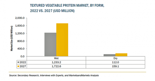 植物性タンパク質 (TVP) の市場規模は、2022年の14億米ドルからCAGR6.9%で成長し、2027年には19億米ドルに達すると予測されています。欧米諸国では、多くの人々が肉の消費を控えた食生活にシフトしており、健康的で味わい深い、肉を使わない食品を必要としています。この消費パターンの変化に伴い、食品メーカーは豆類、小麦グルテン、大豆タンパク質などの植物性タンパク質に重点を置いており、特定の肉の食感、風味、色、栄養特性などを模倣して、肉類似製品に加工されています。