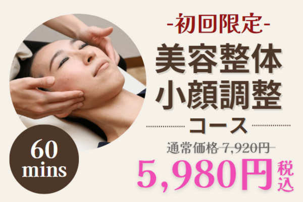 全身整体+骨盤矯正+小顔調整の入った60分コースを、初回ご利用の方限定で特別価格(通常税込7,920円のところ税込5,980円)にてご案内いたします。 全身マッサージに加え、さらに大人気の骨盤・小顔調整のフルコースは身体もお顔もすっき りし、女性らしいボディライン・フェイスラインを追求する貴女にぴったりの特別コースです。