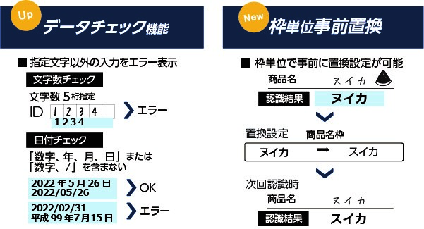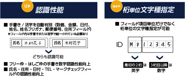 新バージョンでは、高精度なAI-OCRエンジンと熟成された従来のOCRエンジンを効果的に使い分けるハイブリッド型の認識技術を採用しており、「AI自由手書きオプション」による文字枠の無いフリーピッチ手書き文字の認識精度を高めると共に、項目内の桁単位での文字種指定や、認識後におけるエントリー画面の操作性等の向上を行っています。