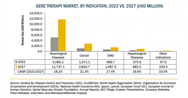 遺伝子治療の市場規模は、2022年の73億米ドルからCAGR18.6%で成長し、2027年には172億米ドルに達すると予測されています。遺伝子治療製品の認可の増加、遺伝子治療の研究開発への投資などの要因が、市場の成長を後押ししています。一方、遺伝子治療のコストが高いことが、この市場の成長を抑制しています。