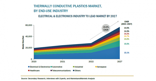 熱伝導性プラスチックの市場規模は、2021年の1億2100万米ドルからCAGR16.2%で成長し、2027年には2億9800万米ドルに達すると予測されています。電気・電子、自動車、産業、ヘルスケア、航空宇宙、通信など、さまざまな最終用途産業における放熱用途の熱伝導性プラスチックに対する需要の高まりが、市場を牽引しています。
