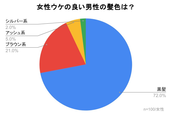 「女性ウケの良い男性の髪色は?」の質問では、『黒髪』が72%、『ブラウン系』が21%、『アッシュ系』が5%、『シルバー系』が2%いう結果となり、72%の女性は男性の黒髪に対して好印象であるという結果となりました。