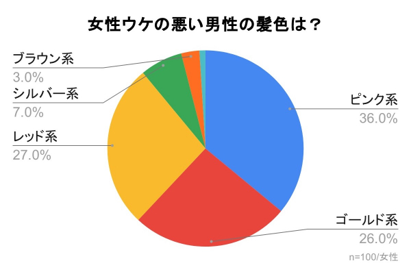 「女性ウケの悪い男性の髪色は?」の質問では、『ピンク系』が36%、『レッド系』が27%、『ゴールド系』が26%、『シルバー系』が7%、『ブラウン系』が3%いう結果となり、派手な色、明るい色に対しては印象が良くないという結果となりました。