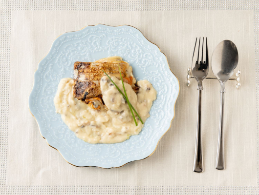 夏から秋にかけて旬を迎える上質な太刀魚で、きのこやお野菜を包み、やさしく蒸し煮にしました。添付してある、新鮮な魚と香味野菜から取った濃厚なフュメ・ド・ポワソン(魚のだし)をベースに、きのこのうま味も効いたクリーミーなソースと一緒にお召しあがりください。柔らかい食感の太刀魚とお野菜の食感、濃厚なクリームソースのハーモニーが、食卓に贅沢な時間を演出してくれます。Bon Quishならではの藤井シェフ特製フレンチを、お楽しみください。