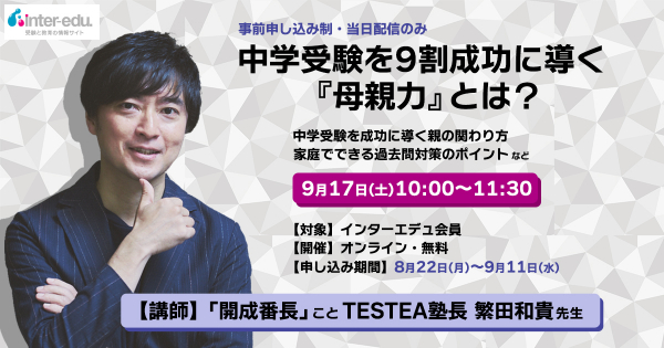 日本最大級の受験教育情報サイト「インターエデュ・ドットコム」は、2022年9月17日(土)に、中学受験を目指すお子さまの保護者に向けたZoomオンラインセミナーを、インターエデュ会員限定で開催します。