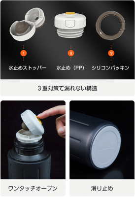 しっかり密封構造なので、横にしても水が漏れにくく、バッグに入れても安心です。本体のフタはワンタッチでカンタンに開きます。底部は滑り止めがついていて、どこにおいても安定感があり、不快な金属音がしません。