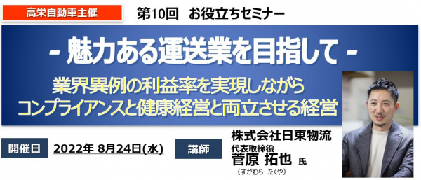 リユースショップ事業を中心に、幅広く事業を展開するトミザワグループの企業として、首都圏を中心に質の高いカーライフサポート事業を展開する高栄自動車工業株式会社(本社:東京都江戸川区、代表取締役:富沢博)は、さる8月24日(火)に物流事業者向けセミナーを開催(年2回定期開催)、第10回目を数える今回は、千葉県・四街道市で冷凍・チルド帯の食品を中心とした運送事業を展開する、株式会社日東物流の菅原拓也氏にご登壇頂きました。