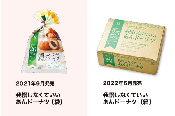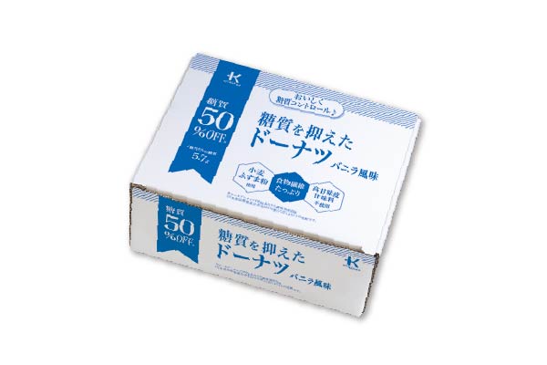 『糖質を抑えたドーナツ バニラ風味』は、糖質を50%カット※し糖質コントロールがし易く、食物繊維たっぷりで甘すぎない味わいを採用する事で、エンドユーザに手にとって頂きやすい商品設計としました。また製品の口当たりをより良くするため従来品比でパサつき感を抑えた生地を採用しています。また商品パッケージに関しては、糖質オフのライトで健康的なイメージを強調し、罪悪感を感じずにドーナツを喫食できるイメージをエッセンスに加え全体的にシンプルでクリーンなデザインとしました。