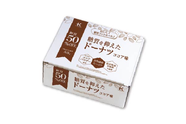 『糖質を抑えたドーナツ ココア味』は、糖質を50%カット※し糖質コントロールがし易く、食物繊維たっぷりでココアの風味を効かせた甘すぎない味わいを採用する事で、エンドユーザに手にとって頂きやすい商品設計としました。また製品の口当たりをより良くするため従来品比でパサつき感を抑えた生地を採用しています。また商品パッケージに関しては、糖質オフのライトで健康的なイメージを強調し、罪悪感を感じずにココア味のドーナツを喫食できるイメージをエッセンスに加え全体的にシンプルでクリーンなデザインとしました。