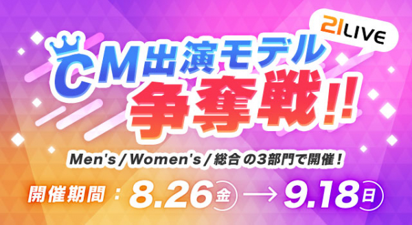 株式会社エムアンドティーティー(本社:沖縄県北谷町、代表取締役:井藤 三知子)が運営するエンターテイメント・ライブ配信サイト【21LIVE(ニーイチライブ)】URL: https://21.live は、8月26日(金)から9月18日(日)の期間中、CM出演権を賭けたランキングイベントを開催いたします。