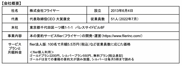 株式会社フライヤーは、本の要約サービス「flier(フライヤー)」を運営する、ITベンチャー(2013年6月設立)です。最大の特長は「書評(レビュー)」ではなく「要約」である点です。書き手の主観が入る書評とは異なり、著者の主張や論理(重要ポイントや全体像)を忠実にまとめ、読者に伝えます。書評でないため、出版社と著者から要約の許可を得る必要があり、要約した原稿にも目を通していただくことで、高品質なサービスを提供しています。