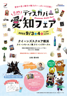 愛知の観光物産展「こってりだけじゃない。ディスカバー愛知フェア」は、「株式会社アルファポイント」が企画・運営・管理を行い、2022年9月3日(土)・4日(日)の2日間、クイーンズスクエア横浜1階のイベントスペース「クイーンズサークル」にて開催いたします。