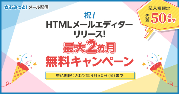 “おもてなしを科学する”株式会社イー・エージェンシー(本社:東京都千代田区、代表取締役:甲斐真樹)が提供する自社プロダクトブランド「さぶみっと!」の1つである、メール配信ツール「さぶみっと!メール配信」は、HTMLエディターリリースにあたり、2022年8月25日(木)から9月30日(金)までにお申し込みいただくと、10月31日(月)まで無料でご利用いただけるキャンペーンを実施いたします。