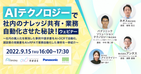 AIポータルメディアAIsmileyは、2022年9月15日(木)16時から社内のナレッジ共有・業務自動化させた秘訣ウェビナーを開催します。