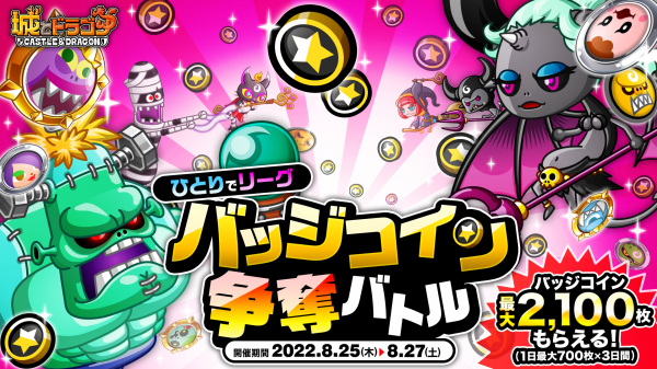 株式会社アソビズム(本社:東京都千代田区、代表取締役:大手智之)は、App Store・Google Playにて好評配信中の『城とドラゴン』で、2022年8月25日(木)より「ひとりでリーグバッジコイン争奪バトル」を開催いたします。