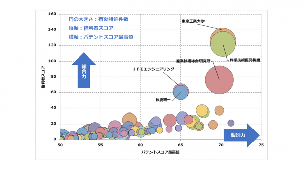1位 東京工業大学の注目度の高い特許には、科学技術振興機構との共願である「アンモニアを合成するための安定で高性能な触媒物質及びアンモニア製造方法」や、味の素との共願である「液体アンモニアの貯蔵・輸送・保安に伴う周辺設備・コストを簡易化・削減することができる含窒素製品の製造方法」などが挙げられます。