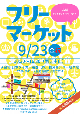 日本タイガー電器株式会社(本社:大阪府高槻市、代表:津田眞秀)は、同社運営のフリーマーケットイベント「高槻わくわくフリマ♪」(https://fleamkt.santasan.net/)を同社物流センター駐車場(高槻市須賀町)にて2022年9月23日(木祝)に開催します。