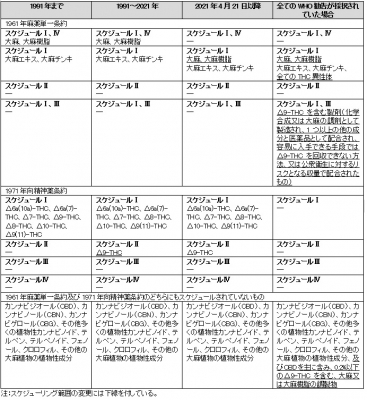 図1 大麻関連規制薬物の国際的なスケジューリング状況について、1991年及び2021年の変更前と変更後の比較、及びWHOの勧告する変更について