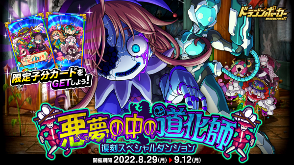 株式会社アソビズム(本社:東京都千代田区、代表取締役:大手智之)は、App Store・Google Playにて好評配信中のリアルタイム合体カードバトル『ドラゴンポーカー』で、2022年8月29日(月)より復刻スペシャルダンジョン「悪夢の中の道化師」を開催いたします。