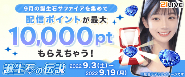 株式会社エムアンドティーティー(本社:沖縄県北谷町、代表取締役:井藤 三知子)が運営するエンターテイメント・ライブ配信サービス【21LIVE(ニーイチライブ)】URL: https://21.live では9月3日(土)から9月19日(月)まで、誕生石ギフト・サファイアの獲得数を競うランキングを開催いたします。