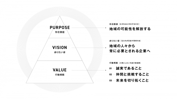 制定にあたっては、地域には沢山のチャンスが存在しており、地域を元気にすることで、地域から日本を元気にしたいという創業時より想いかつ信じてきたことを明文化しました。企業活動を通じて、地域の未来を創造できる想いと力を持った人材を増やし、地域課題を解決する事業を創り、広げていくことで、当社はパーパスの実現を目指してまいります。
