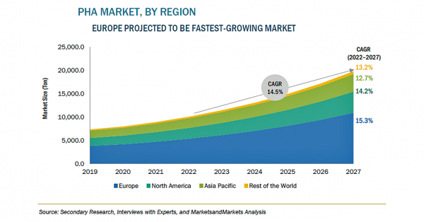 ポリヒドロキシアルカノエート(PHA)の市場規模は、2022年の8100万米ドルからCAGR15.3%で成長し、2027年には1億6700万米ドルに達すると予測されています。石油系プラスチックの使用に関する政府の厳しい規制が実施されていることにより、非分解性プラスチックの削減に注目が高まっています。PHAの世界的な需要は、包装・食品サービス、バイオメディカル、農業などのさまざまな用途で、今後、大幅に増加することが予想されます。