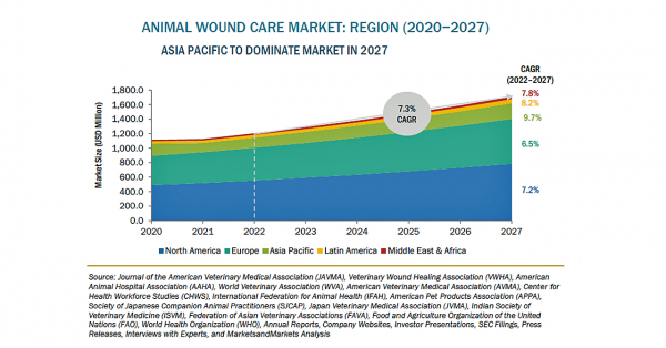 コンパニオンアニマル数と飼育率の急増は、世界規模で目撃されています。コンパニオンアニマルを飼うことは、不整脈の減少、血圧の正常化、不安の減少、心理的安定性の向上、幸福感の改善など、健康上の利点と関連しています。都市化の進展が、動物の健康に対する一人当たりの支出を増加させている主な要因となっています。現在、飼い主は動物の健康のためにお金を使うことを望んでおり、飼い主の意識の高まりや、高度なサービスを提供する獣医師の能力向上が、さまざまな動物の創傷ケア製品の需要を生み出しています。ペット人口の増加により、ペットケア製品やサービスの需要が高まり、動物用創傷治療市場をはじめとする関連市場の成長を支えることが予想されます。