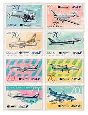 (↑)「ANA STORE@SKY」にて本商品をご購入いただいたお客様限定特典の特製ステッカー。本商品にもあしらわれている8機の飛行機イラストを切手風のデザインにしました。