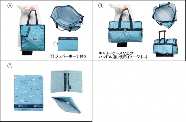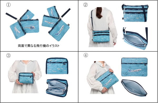 2019年の発売以降、毎回人気の「LeSportsac for ANA」シリーズ。今回はANA創立70周年記念として、初めて一からデザインしたオリジナルプリントの生地を使用しました。特別に描き下ろしたANA歴代の飛行機(BELL47/DC-3/L-1011/テクノジャンボ/777-300ER型機/ANA ゴールドジェット/エコボン/787-8型機)のイラストが、アメリカ生まれのLeSportsacらしいブルーのデニム調のプリントに描かれ、爽やかな印象に仕上がっています。なお、商品によって総柄と大きく飛行機をプリントした生地を使い分け、買い揃えてもお楽しみいただけるよう工夫しました。飛行機ファンの方にもお馴染みの機種や、形状やカラーが個性的な機種を “Take off for the future(未来へ歴史をつなげる)”というメッセージとともにデザインした、ここでしか入手できない貴重な商品となっています。